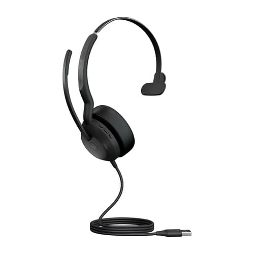 Jabra Evolve2 50. Type de produit: Casque. Technologie de connectivité: Avec fil &sans fil, Bluetooth. Utilisation recommandée: Bureau/Centre d'appels. Fréquence des écouteurs: 20 - 20000 Hz. Portée du routeur sans fil: 30 m. Longueur de câble: 1,7 m. Poids: 99 g. Couleur du produit: Noir
