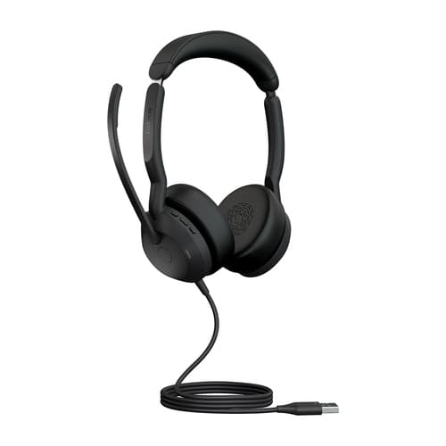 Jabra Evolve2 50. Type de produit: Casque. Technologie de connectivité: Avec fil &sans fil, Bluetooth. Utilisation recommandée: Bureau/Centre d'appels. Fréquence des écouteurs: 20 - 20000 Hz. Portée du routeur sans fil: 30 m. Longueur de câble: 1,7 m. Poids: 148,9 g. Couleur du produit: Noir