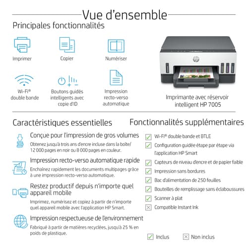 HP Smart Tank 7005 Sans fil All-in-One Couleur Imprimante, Impression recto-verso; copieur, scanner. Technologie d'impression: A jet d'encre thermique, Impression: Impression couleur, Résolution maximale: 4800 x 1200 DPI, Vitesse d'impression (couleur, qualité normale, A4/US Letter): 9 ppm. Copier: Copie couleur, Résolution max. des copies: 600 x 600 DPI. Numérisation: Numérisation couleur, Résolution de numérisation optique: 1200 x 1200 DPI. Taille de papier de série A ISO maximum: A4. Wifi. Impression directe. Couleur du produit: Gris, Blanc
