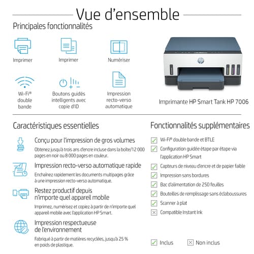 HP Smart Tank 7006 Sans fil All-in-One Couleur Imprimante, Impression recto-verso; copieur, scanner. Technologie d'impression: A jet d'encre thermique, Impression: Impression couleur, Résolution maximale: 4800 x 1200 DPI, Vitesse d'impression (couleur, qualité normale, A4/US Letter): 9 ppm. Copier: Copie couleur, Résolution max. des copies: 600 x 600 DPI. Numérisation: Numérisation couleur, Résolution de numérisation optique: 1200 x 1200 DPI. Taille de papier de série A ISO maximum: A4. Wifi. Impression directe. Couleur du produit: Bleu, Gris, Blanc