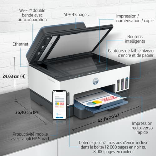 HP Smart Tank 7306 Sans fil All-in-One Couleur Imprimante, Impression recto-verso; copieur, scanner. Technologie d'impression: A jet d'encre thermique, Impression: Impression couleur, Résolution maximale: 4800 x 1200 DPI, Vitesse d'impression (couleur, qualité normale, A4/US Letter): 9 ppm. Copier: Copie couleur, Résolution max. des copies: 600 x 600 DPI. Numérisation: Numérisation couleur, Résolution de numérisation optique: 1200 x 1200 DPI. Fonctions recto verso: Impression. Taille de papier de série A ISO maximum: A4. Wifi. Impression directe. Couleur du produit: Gris