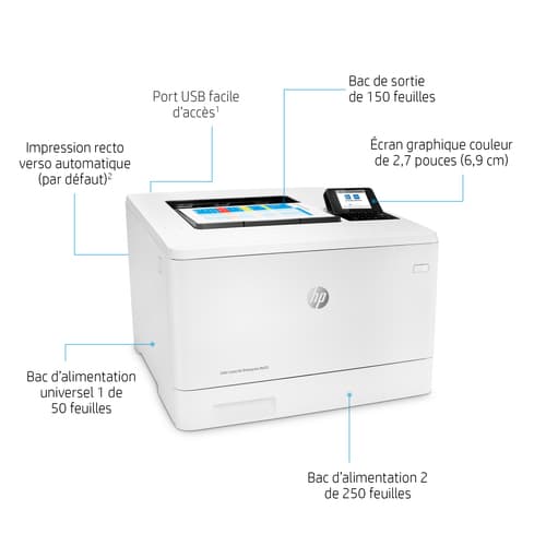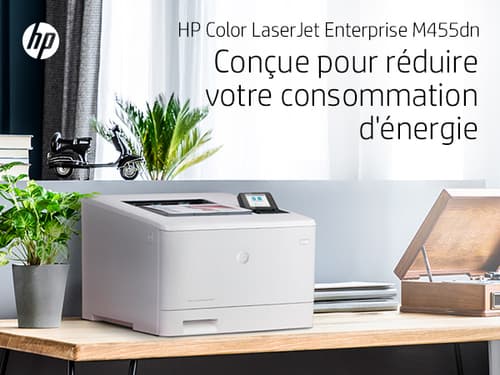 HP Color LaserJet Enterprise LaserJet Enterprise M455dn Couleur Imprimante, Ethernet uniquement; Recto verso. Technologie d'impression: Laser, Couleur. Nombre de cartouches d'impression: 4, Cycle de service (Maximum): 55000 pages par mois. Résolution maximale: 600 x 600 DPI. Taille de papier de série A ISO maximum: A4. Vitesse d'impression (noir, qualité normale, A4/US Letter): 27 ppm, Impression recto-verso. Écran: LCD. Réseau prêt à l'usage, Wifi. Couleur du produit: Blanc
