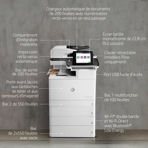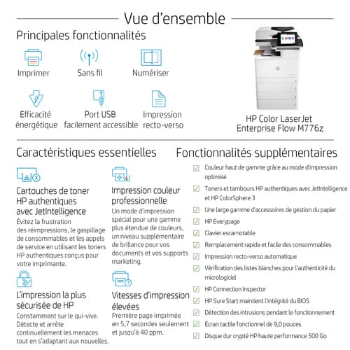HP Color LaserJet Enterprise Flow LaserJet Enterprise Flow M776z Sans fil Multifunction Couleur Imprimante, Copieur, Scanner; Recto verso. Technologie d'impression: Laser, Impression: Impression couleur, Résolution maximale: 1200 x 1200 DPI, Vitesse d'impression (couleur, qualité normale, A4/US Letter): 46 ppm. Copier: Copie couleur, Résolution max. des copies: 600 x 600 DPI. Numérisation: Numérisation couleur, Résolution de numérisation optique: 600 x 600 DPI. Télécopier: Télécopie couleur. Fonctions recto verso: Impression. Taille de papier de série A ISO maximum: A3. Wifi. Impression directe. Couleur du produit: Noir, Blanc