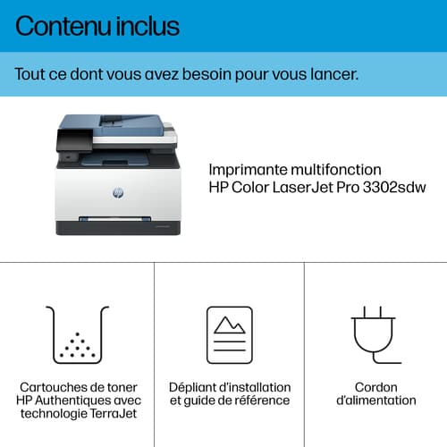 HP LaserJet Pro 3302sdw Sans fil Multifunction Couleur Imprimante, Copieur, Scanner; Recto verso. Technologie d'impression: Laser, Couleur. Nombre de cartouches d'impression: 4, Cycle de service (Maximum): 40000 pages par mois. Résolution maximale: 600 x 600 DPI. Taille de papier de série A ISO maximum: A4. Vitesse d'impression (noir, qualité normale, A4/US Letter): 25 ppm, Impression recto-verso. Écran: TFT. Wifi. Couleur du produit: Bleu, Gris