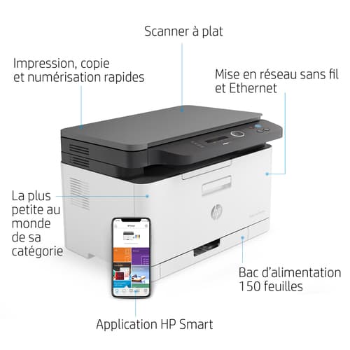 HP Laser 178nw Sans fil Multifunction Couleur Imprimante, Copieur, Scanner; Recto verso. Technologie d'impression: Laser, Couleur. Nombre de cartouches d'impression: 4, Cycle de service (Maximum): 20000 pages par mois. Résolution maximale: 600 x 600 DPI. Taille de papier de série A ISO maximum: A4. Vitesse d'impression (noir, qualité normale, A4/US Letter): 18 ppm, Impression recto-verso. Écran: LCD. Wifi. Couleur du produit: Gris, Blanc