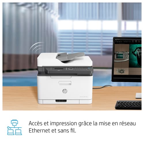 HP Laser 179fnw Sans fil Multifunction Couleur Imprimante, Copieur, Scanner; Recto verso. Technologie d'impression: Laser, Couleur. Nombre de cartouches d'impression: 4, Cycle de service (Maximum): 20000 pages par mois. Résolution maximale: 600 x 600 DPI. Taille de papier de série A ISO maximum: A4. Vitesse d'impression (noir, qualité normale, A4/US Letter): 18 ppm, Impression recto-verso. Écran: LCD. Wifi. Couleur du produit: Noir, Blanc