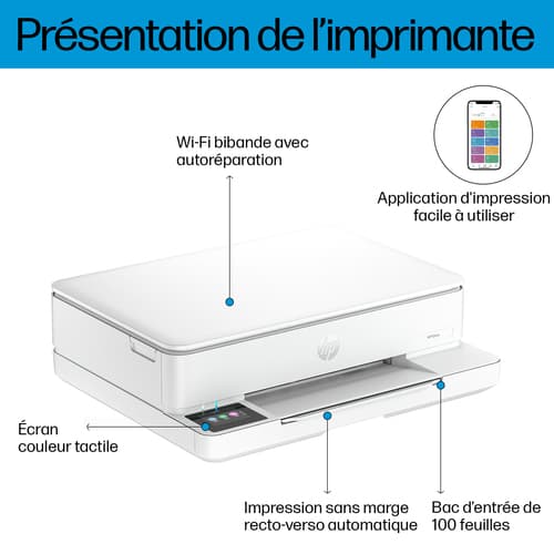 HP ENVY 6110e Wireless All-in-One Couleur Imprimante, Instant Ink; Impression photo. Technologie d'impression: A jet d'encre thermique, Impression: Impression couleur, Résolution maximale: 4800 x 1200 DPI, Vitesse d'impression (couleur, qualité normale, A4/US Letter): 7 ppm. Copier: Copie couleur, Résolution max. des copies: 300 x 300 DPI. Numérisation: Numérisation couleur, Résolution de numérisation optique: 1200 x 1200 DPI. Taille de papier de série A ISO maximum: A4. Wifi. Couleur du produit: Blanc