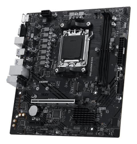 MSI PRO A620AM-B EVO. Fabricant de processeur: AMD, Socket de processeur (réceptable de processeur): Emplacement AM5, Processeurs compatibles: AMD Ryzen 7000 Series, AMD Ryzen 8000 Series, AMD Ryzen 9000 Series. Types de mémoire pris en charge: DDR5-SDRAM, Mémoire interne maximale: 128 Go, Type de support (slot): DIMM. Interfaces de lecteur de stockage prises en charge: M.2, SATA III, Niveaux RAID: 0, 1, 10. Type d'interface Ethernet: 5 Gigabit Ethernet. composant pour: PC, Elément de forme de carte mère: ATX, famille de composant de produits: AMD