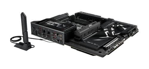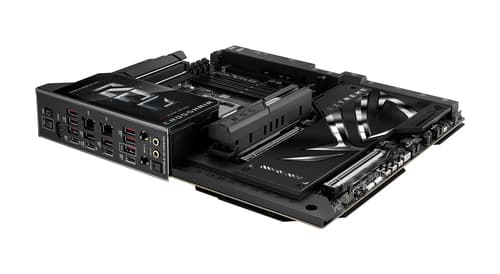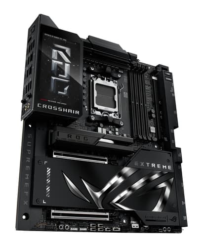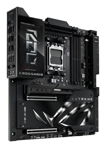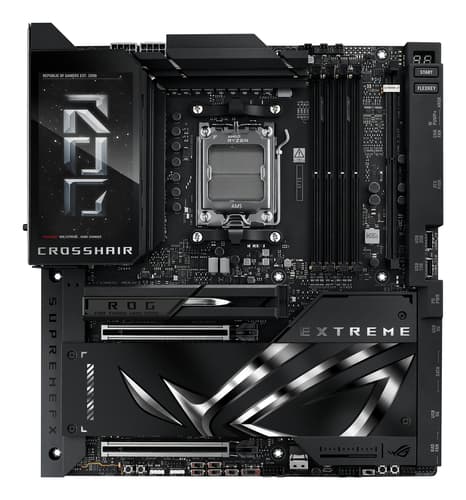 ASUS ROG CROSSHAIR X870E EXTREME. Fabricant de processeur: AMD, Socket de processeur (réceptable de processeur): Emplacement AM5, Processeurs compatibles: AMD Ryzen 7000 Series, AMD Ryzen 8000 Series, AMD Ryzen 9000 Series. Types de mémoire pris en charge: DDR5-SDRAM, Mémoire interne maximale: 256 Go, Type de support (slot): DIMM. Interfaces de lecteur de stockage prises en charge: M.2, SATA III, SlimSAS, Types de lecteurs de stockage pris en charge: HDD & SSD, Niveaux RAID: 0, 1, 5, 10. Type d'interface Ethernet: 5 Gigabit Ethernet, 10 Gigabit Ethernet, Norme Wi-Fi: Wi-Fi 7 (802.11be), Standards wifi: Wi-Fi 7 (802.11be). composant pour: PC, Elément de forme de carte mère: ATX étendu, famille de composant de produits: AMD