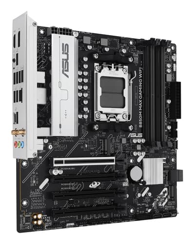 ASUS B850M MAX GAMING WIFI. Fabricant de processeur: AMD, Socket de processeur (réceptable de processeur): Emplacement AM5, Processeurs compatibles: AMD Ryzen 7000 Series, AMD Ryzen 8000 Series, AMD Ryzen 9000 Series. Types de mémoire pris en charge: DDR5-SDRAM, Mémoire interne maximale: 256 Go, Type de support (slot): DIMM. Interfaces de lecteur de stockage prises en charge: M.2, SATA III, Types de lecteurs de stockage pris en charge: HDD & SSD, Niveaux RAID: 0, 1, 5, 10. Type d'interface Ethernet: Gigabit Ethernet, Norme Wi-Fi: Wi-Fi 6 (802.11ax), Standards wifi: Wi-Fi 6 (802.11ax). composant pour: PC, Elément de forme de carte mère: micro ATX, famille de composant de produits: AMD