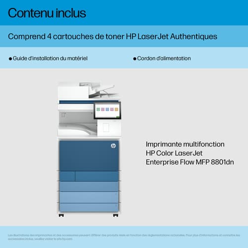 HP LaserJet Enterprise 8801dn Multifunction Couleur Imprimante, Uniquement Ethernet; Duplex; copieur, scanner. Technologie d'impression: Laser, Impression: Impression couleur, Résolution maximale: 1200 x 1200 DPI, Vitesse d'impression (couleur, qualité normale, A4/US Letter): 60 ppm. Copier: Copie couleur, Résolution max. des copies: 600 x 600 DPI. Numérisation: Numérisation couleur, Résolution de numérisation optique: 600 x 600 DPI. Télécopier: Télécopie couleur. Fonctions recto verso: Impression. Taille de papier de série A ISO maximum: A4. Wifi. Impression directe. Couleur du produit: Bleu, Blanc