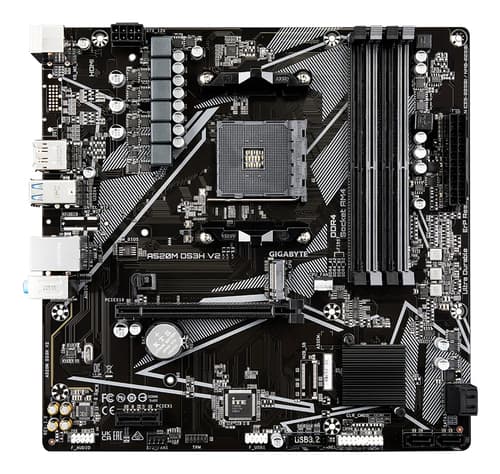 GIGABYTE Carte mère A520M DS3H V2 - Prend en charge les processeurs AMD Ryzen série 5000 AM4, jusqu'à 4733 MHz DDR4 (OC), PCIe 3.0 x16, LAN GbE, USB 3.2 Gen 1. Fabricant de processeur: AMD, Socket de processeur (réceptable de processeur): Emplacement AM4, Processeurs compatibles: AMD Ryzen 3000 Series, AMD Ryzen Threadripper 3000 Series, AMD Ryzen Threadripper PRO 3000 WX-Series. Types de mémoire pris en charge: DDR4-SDRAM, Mémoire interne maximale: 128 Go, Type de support (slot): DIMM. Interfaces de lecteur de stockage prises en charge: M.2, SATA III, Types de lecteurs de stockage pris en charge: HDD & SSD, Niveaux RAID: 0, 1, 10. Résolution maximale: 5120 x 2880 pixels. Connecteur USB: USB Type-A