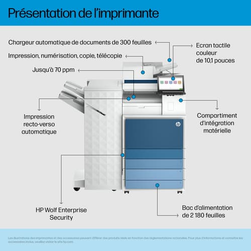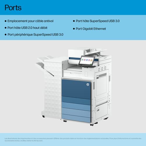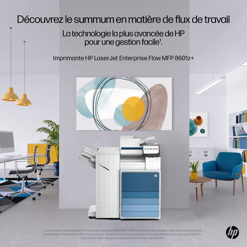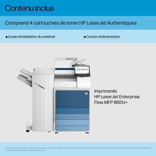 HP Color LaserJet Enterprise Flow LaserJet Enterprise 8601Z+ Multifunction Noir et blanc Imprimante, Uniquement Ethernet; Duplex; copieur, scanner. Technologie d'impression: Laser, Impression: Impression mono, Résolution maximale: 1200 x 1200 DPI. Copier: Copie simple, Résolution max. des copies: 600 x 600 DPI. Numérisation: Numérisation couleur, Résolution de numérisation optique: 600 x 600 DPI. Télécopier: Télécopie simple. Fonctions recto verso: Impression. Taille de papier de série A ISO maximum: A3. Wifi. Impression directe. Couleur du produit: Noir, Blanc