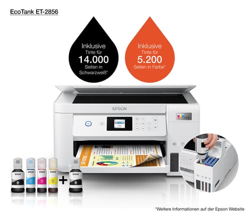 Epson EcoTank ET-2856, Jet d'encre, Impression couleur, 5760 x 1440 DPI, A4, Impression directe, Blanc
