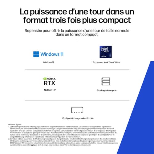 HP Z2 SFF G1i. Famille de processeur: Intel Core Ultra 7, Modèle de processeur: 265. Mémoire interne: 16 Go, Type de mémoire interne: DDR5-SDRAM, Fréquence de la mémoire: 5600 MHz. Capacité totale de stockage: 1 To, Supports de stockage: SSD. Modèle d'adaptateur graphique inclus: Intel Graphics, Modèle d'adaptateur graphique distinct: NVIDIA RTX A400. Système d'exploitation installé: Windows 11 Pro. Alimentation d'énergie: 500 W. Type de châssis: SFF. Type de produit: Station de travail. Poids: 4 kg. Couleur du produit: Noir
