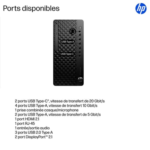 HP EliteDesk 8 Tower G1i Desktop AI PC Wolf Pro Security Edition. Famille de processeur: Intel Core Ultra 5, Modèle de processeur: 235. Mémoire interne: 8 Go, Type de mémoire interne: DDR5-SDRAM, Fréquence de la mémoire: 5600 MHz. Capacité totale de stockage: 256 Go, Supports de stockage: SSD. Modèle d'adaptateur graphique inclus: Intel Graphics. Wifi. Système d'exploitation installé: Windows 11 Pro. Alimentation d'énergie: 280 W. Type de châssis: Tower. Type de produit: PC. Poids: 6,22 kg. Couleur du produit: Noir