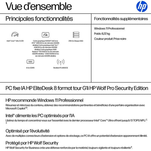 HP EliteDesk 8 Tower G1i Desktop AI PC Wolf Pro Security Edition, Intel Core Ultra 5, 235, 8 Go, DDR5-SDRAM, 256 Go, Windows 11 Pro
