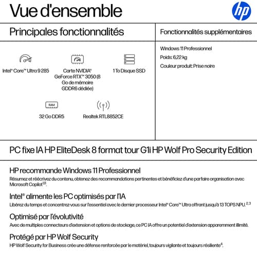 HP EliteDesk 8 Tower G1i AI Wolf Pro Security Edition. Famille de processeur: Intel Core Ultra 9, Modèle de processeur: 285. Mémoire interne: 32 Go, Type de mémoire interne: DDR5-SDRAM, Fréquence de la mémoire: 5600 MHz. Capacité totale de stockage: 1 To, Supports de stockage: SSD. Modèle d'adaptateur graphique inclus: Intel Graphics, Modèle d'adaptateur graphique distinct: NVIDIA GeForce RTX 3050. Système d'exploitation installé: Windows 11 Pro. Alimentation d'énergie: 400 W. Type de châssis: Tower. Type de produit: PC. Poids: 6,22 kg. Couleur du produit: Noir
