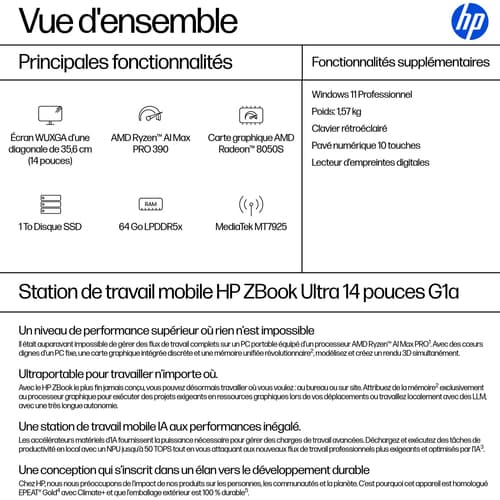 HP ZBook Ultra G1a. Type de produit: Station de travail mobile, Format: Clapet. Famille de processeur: AMD Ryzen AI Max PRO, Modèle de processeur: 390, Fréquence du processeur: 3,2 GHz. Taille de l'écran: 35,6 cm (14"), Type HD: WUXGA, Résolution de l'écran: 1920 x 1200 pixels. Mémoire interne: 64 Go, Type de mémoire interne: LPDDR5x-SDRAM. Capacité totale de stockage: 1 To, Supports de stockage: SSD. Modèle d'adaptateur graphique inclus: AMD Radeon 8050S. Système d'exploitation installé: Windows 11 Pro. Couleur du produit: Gris