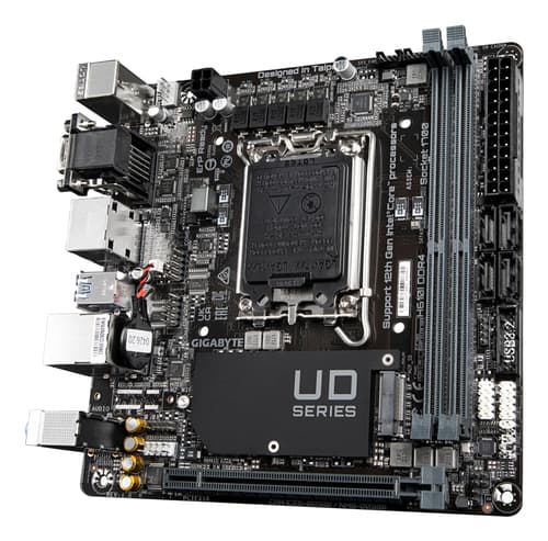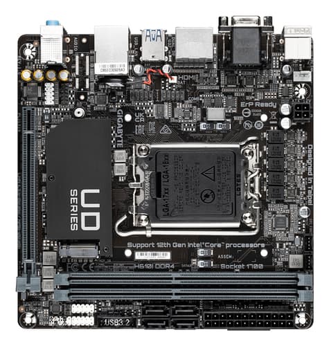 GIGABYTE H610I DDR4 Carte mère - Compatible avec processeurs Intel Core 14th CPUs, 4+1+1 Hybrid Digital VRM, up to 3200MHz DDR4, 1xPCIe 3.0 M.2, GbE LAN, USB 3.2 Gen 1. Fabricant de processeur: Intel, Socket de processeur (réceptable de processeur): LGA 1700, Processeurs compatibles: Intel® Celeron®, Intel® Core™ i3, Intel® Core™ i5, Intel® Core™ i7, Intel® Core™ i9,.... Types de mémoire pris en charge: DDR4-SDRAM, Mémoire interne maximale: 64 Go, Type de support (slot): DIMM. Interfaces de lecteur de stockage prises en charge: M.2, SATA III, Types de lecteurs de stockage pris en charge: HDD & SSD. Résolution maximale: 4096 x 2304 pixels. Connecteur USB: USB Type-A