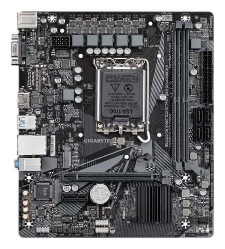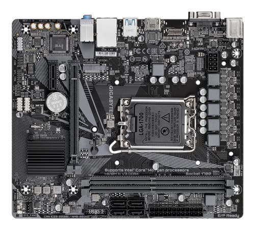 GIGABYTE H610M H V3 DDR4 Carte mère - Compatible avec processeurs Intel Core 14th CPUs, 4+1+1 Hybrid Phases Digital VRM, up to 3200MHz DDR4, 1xPCIe 3.0 M.2, GbE LAN, USB 3.2 Gen 1. Fabricant de processeur: Intel, Socket de processeur (réceptable de processeur): LGA 1700, Processeurs compatibles: Intel® Celeron®, Intel® Core™ i3, Intel® Core™ i5, Intel® Core™ i7, Intel® Core™ i9,.... Types de mémoire pris en charge: DDR4-SDRAM, Mémoire interne maximale: 64 Go, Type de support (slot): DIMM. Interfaces de lecteur de stockage prises en charge: M.2, SATA III, Types de lecteurs de stockage pris en charge: HDD & SSD. Famille d'adaptateur graphique: Intel, Adaptateur graphique: HD Graphics, Résolution maximale: 4096 x 2304 pixels. Connecteur USB: USB Type-A