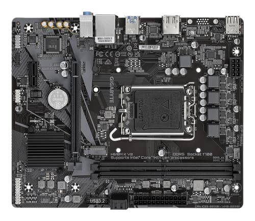 GIGABYTE H610M K V2 Carte mère - Processeurs Intel Core 14ᵉ génération, jusqu'à 5600 MHz DDR5, 1xPCIe 3.0 M.2, LAN 1GbE, USB 3.2 Gen 1. Fabricant de processeur: Intel, Socket de processeur (réceptable de processeur): LGA 1700, Processeurs compatibles: Intel® Celeron®, Intel Core i3 12th Gen, Intel Core i3 13th Gen, Intel Core i3 14th Gen, Intel.... Types de mémoire pris en charge: DDR5-SDRAM, Mémoire interne maximale: 128 Go, Type de support (slot): DIMM. Interfaces de lecteur de stockage prises en charge: M.2, PCI Express 3.0, SATA III, Types de lecteurs de stockage pris en charge: HDD & SSD. Résolution maximale: 4096 x 2160 pixels. Type d'interface Ethernet: Gigabit Ethernet, Contrôleur de réseau local (LAN): Realtek RTL8111H
