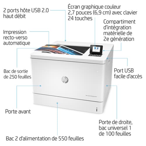 HP Color LaserJet Enterprise LaserJet Enterprise M751dn Couleur Imprimante, Ethernet uniquement; Recto verso. Technologie d'impression: Laser, Couleur. Nombre de cartouches d'impression: 4, Cycle de service (Maximum): 150000 pages par mois. Résolution maximale: 1200 x 1200 DPI. Taille de papier de série A ISO maximum: A3. Vitesse d'impression (noir, qualité normale, A4/US Letter): 41 ppm, Impression recto-verso. Écran: LCD. Wifi. Couleur du produit: Blanc
