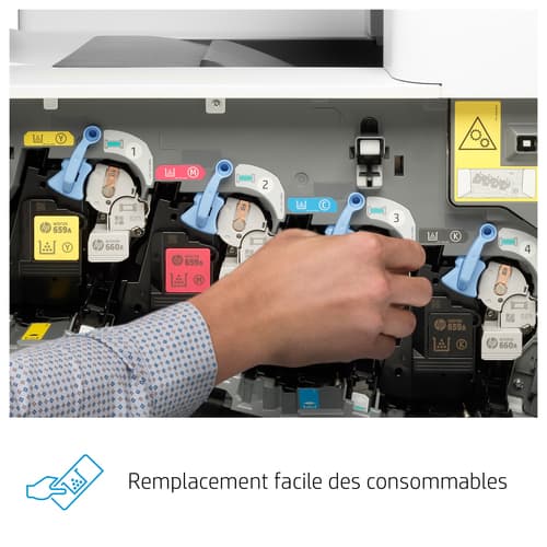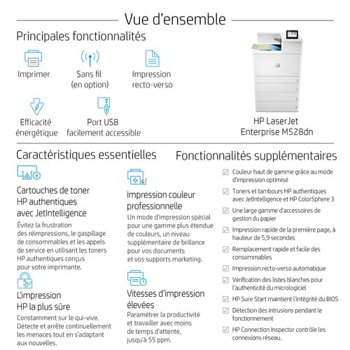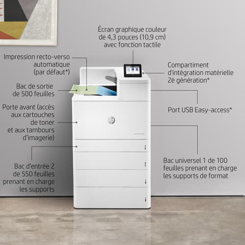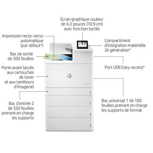HP Color LaserJet Enterprise LaserJet Enterprise M856dn Couleur Imprimante, Ethernet uniquement; Recto verso. Technologie d'impression: Laser, Couleur. Nombre de cartouches d'impression: 4, Cycle de service (Maximum): 250000 pages par mois. Résolution maximale: 1200 x 1200 DPI. Taille de papier de série A ISO maximum: A3. Vitesse d'impression (noir, qualité normale, A4/US Letter): 56 ppm, Impression recto-verso. Écran: CGD. Wifi. Couleur du produit: Blanc