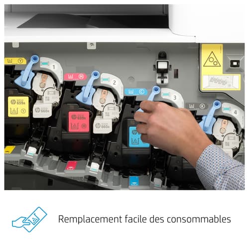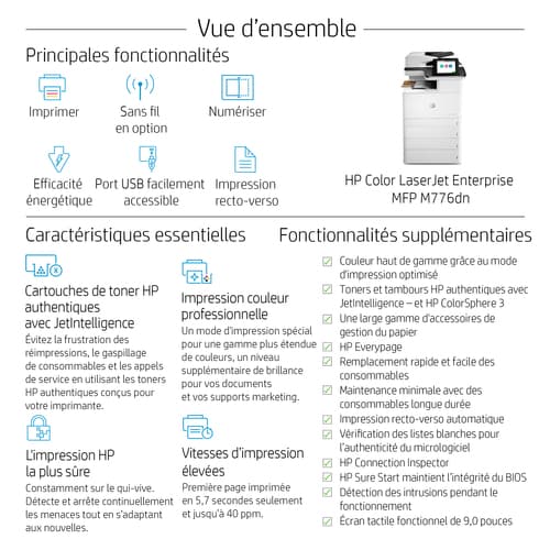 HP Color LaserJet Enterprise LaserJet Enterprise M776dn Multifunction Couleur Imprimante, Ethernet uniquement; Copieur, Scanner. Technologie d'impression: Laser, Impression: Impression couleur, Résolution maximale: 1200 x 1200 DPI, Vitesse d'impression (couleur, qualité normale, A4/US Letter): 46 ppm. Copier: Copie couleur, Résolution max. des copies: 600 x 600 DPI. Numérisation: Numérisation couleur, Résolution de numérisation optique: 600 x 600 DPI. Fonctions recto verso: Impression. Taille de papier de série A ISO maximum: A3. Wifi. Impression directe. Couleur du produit: Noir, Blanc
