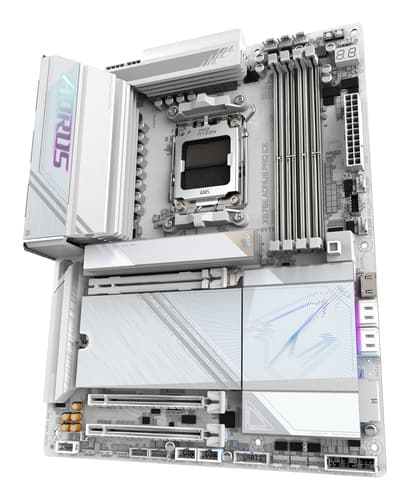 GIGABYTE X870E AORUS PRO ICE Carte Mère - Prend en charge les processeurs AMD Ryzen 9000, 16+2+2 Phases VRM Digital, jusqu'à 8000MHz DDR5 (OC), 3xPCIe 5.0 + 1xPCIe 4.0, Wi-Fi 7, 2.5GbE LAN, USB 4. Fabricant de processeur: AMD, Socket de processeur (réceptable de processeur): Emplacement AM5, Processeurs compatibles: AMD Ryzen 7000 Series, AMD Ryzen 8000 Series, AMD Ryzen 9000 Series. Types de mémoire pris en charge: DDR5-SDRAM, Mémoire interne maximale: 256 Go, Type de support (slot): DIMM. Interfaces de lecteur de stockage prises en charge: M.2, SATA III, Types de lecteurs de stockage pris en charge: HDD & SSD, Niveaux RAID: 0, 1, 10. Type d'interface Ethernet: 2.5 Gigabit Ethernet, Contrôleur de réseau local (LAN): Realtek RTL8125, Norme Wi-Fi: Wi-Fi 7 (802.11be). composant pour: PC, Elément de forme de carte mère: ATX, famille de composant de produits: AMD